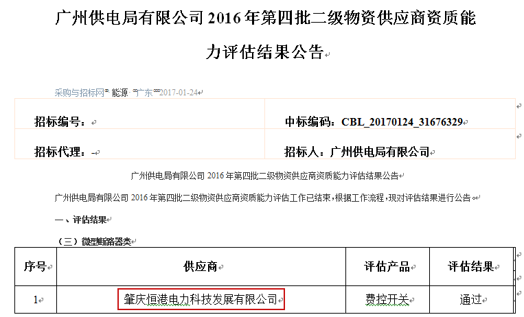 廣州供電局有限公司2016年第四批二級(jí)物資供應(yīng)商資質(zhì)能力評(píng)估結(jié)果公告