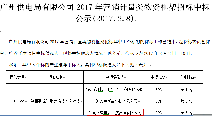 廣州供電局有限公司2017年營銷計量類物資框架招標中標公示