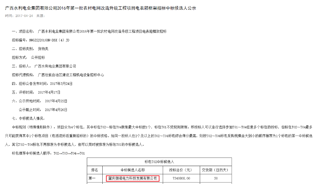 廣西水利電業(yè)集團有限公司2016年第一批農(nóng)村電網(wǎng)改造升級工程項目電表箱框架招標中標候選人公示