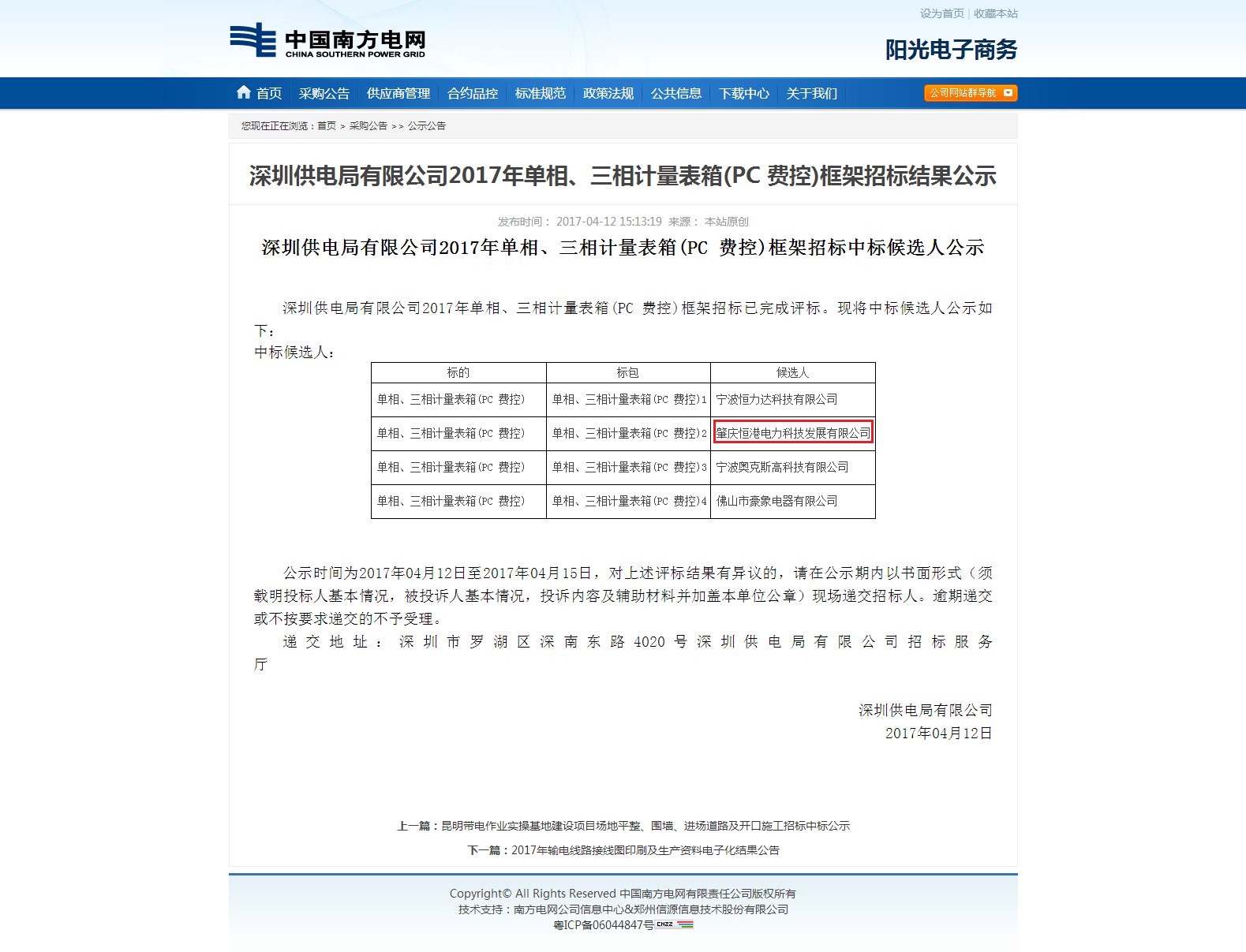 深圳供電局有限公司2017年單相、三相計(jì)量表箱(PC 費(fèi)控)框架招標(biāo)結(jié)果公示
