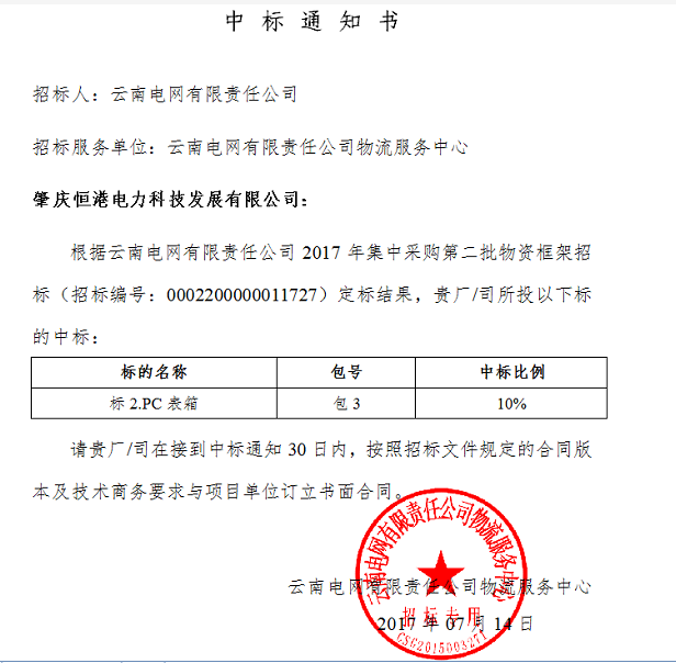 云南電網(wǎng)有限責(zé)任公司2017年集中采購第二批物資框架招標(biāo)結(jié)果公告
