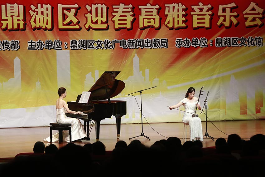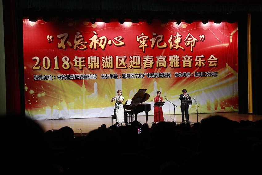 演藝中心華燈璀璨,文化舞臺(tái)音韻悠揚(yáng),2018年1月18日晚,由鼎湖區(qū)委宣傳部指導(dǎo)、區(qū)文廣新局主辦的“不忘初心 牢記使命”2018鼎湖區(qū)迎新年高雅音樂(lè)會(huì)在區(qū)演藝中心隆重上演。音樂(lè)會(huì)在悠揚(yáng)、悅耳的《苗嶺的早晨》中拉開(kāi)帷幕。經(jīng)典樂(lè)曲《梁祝》《茉莉花》等樂(lè)曲讓眾人深情抒發(fā)回到靈魂深處的情懷,耳熟能詳?shù)牧餍袠?lè)曲《卷珠簾》改編成鋼琴曲則拉近了觀眾與演奏者的距離,令觀眾產(chǎn)生情感共鳴,贏得滿堂掌聲。最后,晚會(huì)在四人合奏經(jīng)典名曲《茉莉花》中完美落幕。