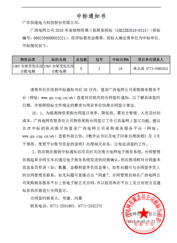 熱烈慶祝我司在【廣西電網2018年省級物資第三批框架招標項目】中中標【10KV臺架變低壓綜合配電箱第3包】