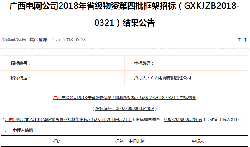 熱烈慶祝我司在廣西電網公司2018年省級物資第四批框架招標中中標3個標包