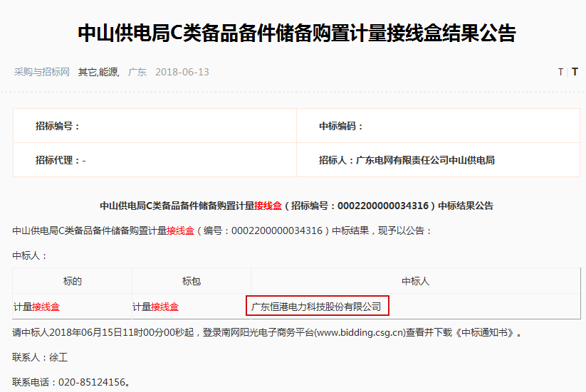 中山供電局C類備品備件儲(chǔ)備購置計(jì)量接線盒中標(biāo)結(jié)果公告