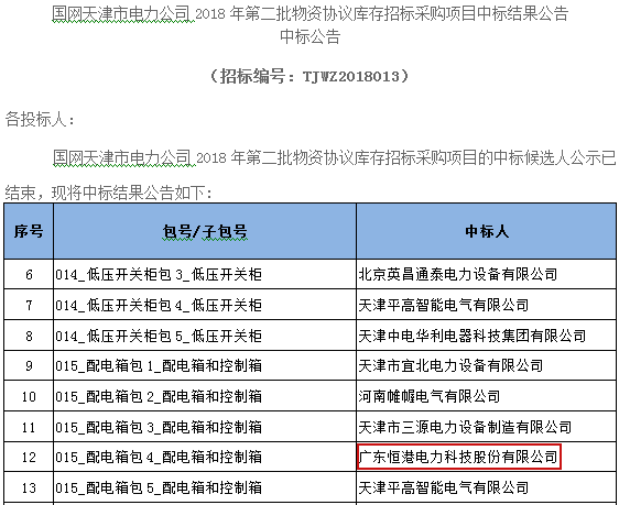 熱烈祝賀我司在國網天津市電力公司2018年第二批物資協議庫存招標采購項目中標配電箱包4