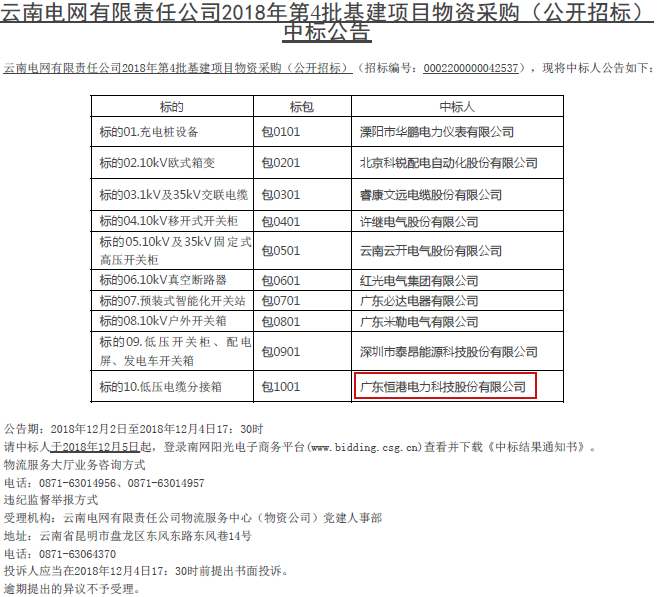 熱烈祝賀我司在云南電網(wǎng)有限責(zé)任公司2018年第4批基建項目物資采購中標