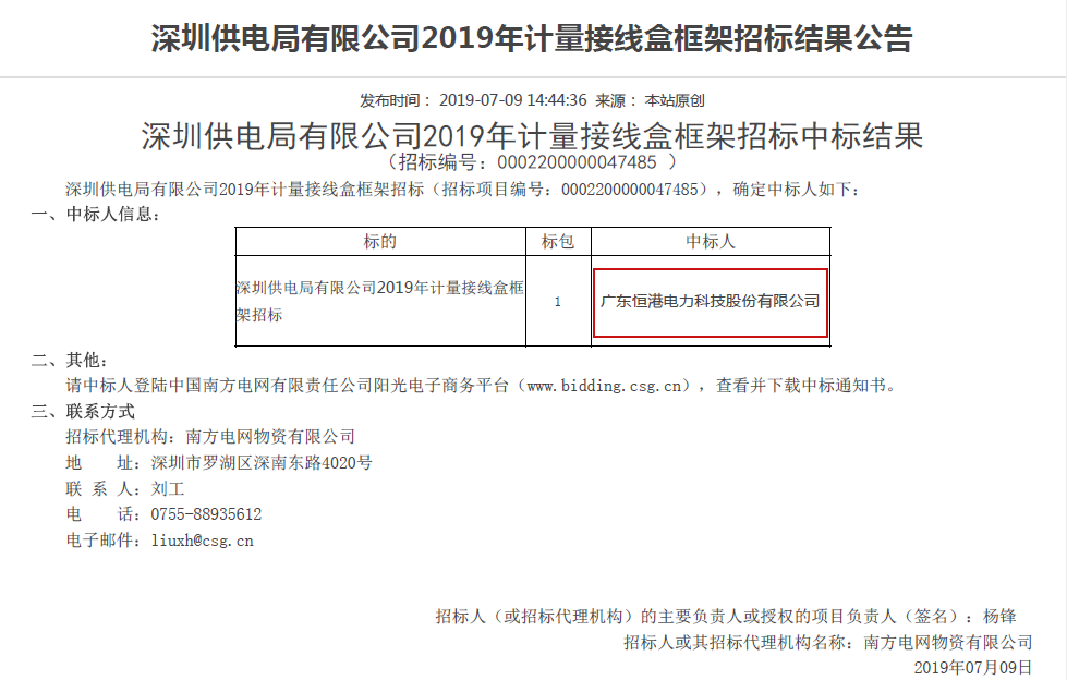 熱烈祝賀我司在深圳供電局有限公司2019年計量接線盒框架招標中標