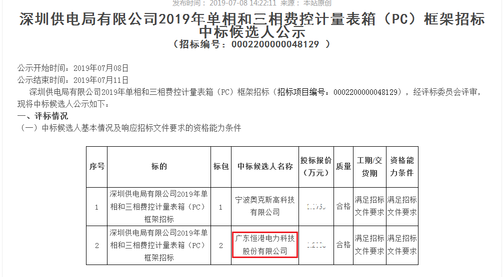 熱烈祝賀我司在深圳供電局有限公司2019年單相和三相費控計量表箱(PC)框架招標中標???????