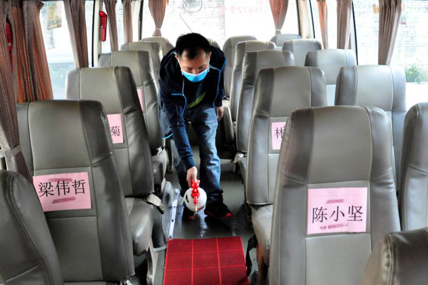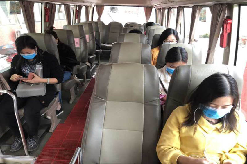 乘坐班車員工,全程帶口罩,按照編排的座位對(duì)號(hào)入座