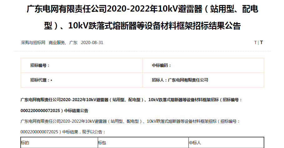 熱烈祝賀我司在廣東電網有限責任公司2020-2022年10kV避雷器(站用型、配電型)、10kV跌落式熔斷器等設備材料框架招標結果中標