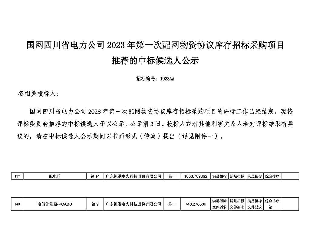 春風(fēng)人間四月天,中標(biāo)喜訊接踵至。4月28日 國(guó)網(wǎng)四川省電力公司傳來(lái)捷報(bào),廣東恒港電力科技股份有限公司中標(biāo)國(guó)網(wǎng)四川省電力公司2023年第一次配網(wǎng)物資協(xié)議庫(kù)存招標(biāo)采購(gòu)項(xiàng)目電能計(jì)量箱PC+ABS 分標(biāo)和配電箱分標(biāo)。成績(jī)的取得凝聚著恒港人的辛勤付出,得益業(yè)內(nèi)外合作者的信任和支持。恒港公司將不負(fù)眾望,上下一心全力以赴,奮勇向前,再奪佳績(jī)?。?!