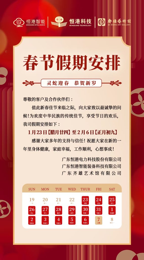 隨著新春佳節的臨近,根據國務院辦公廳通知,結合公司實際情況,2025年春節放假安排如下:2025年1月23日(臘月廿四)至2025年2月6日(正月初九)放假調休,共計15天。2月7日(星期五)正常上班。