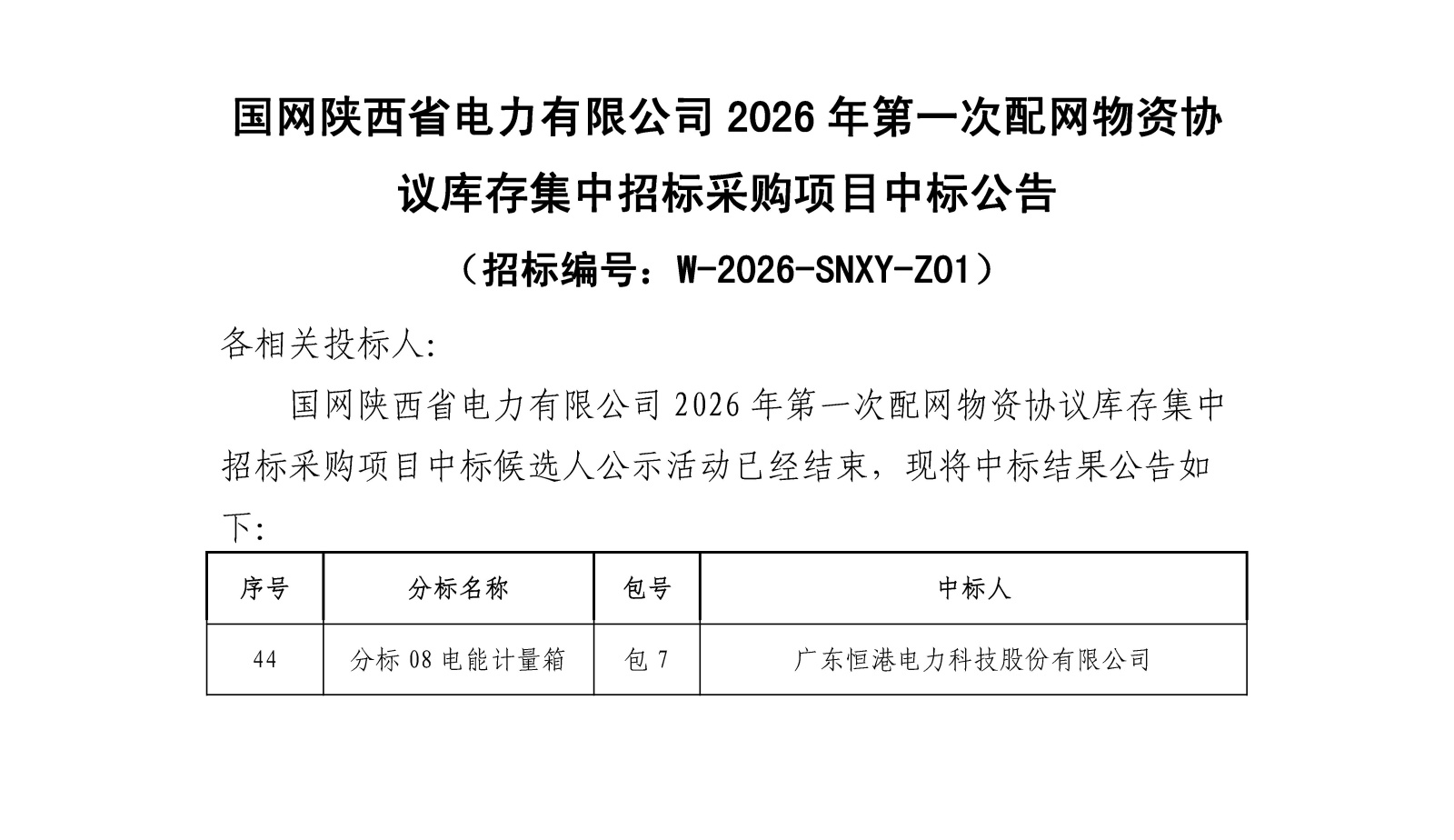 策馬爭先啟新程,實干篤行創佳績!2026年3月27日,國網陜西省電力有限公司 2026 年第一次配網物資協議庫存集中招標采購項目中標結果公示,我司成功中標該項目 “電能計量箱” 標段,喜奪馬年市場開拓開門紅。此次中標,凝聚著全體恒港人的拼搏與付出。未來我們將繼續攜手共進、砥礪奮進,以實干再創佳績、再攀新高!