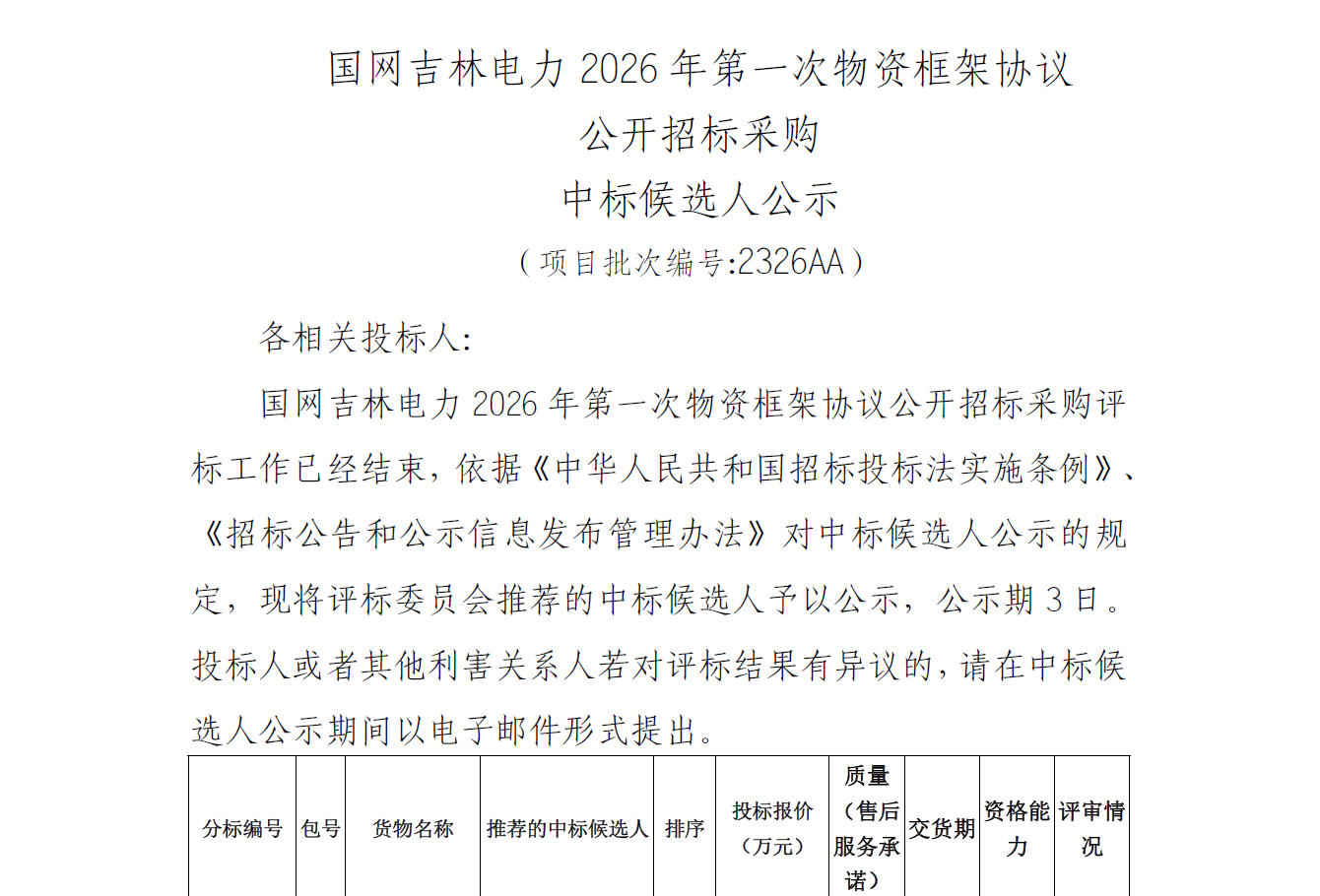 【中標(biāo)喜訊】熱烈祝賀我司中標(biāo)國網(wǎng)吉林電力2026年第一次物資框架協(xié)議公開招標(biāo)采購項(xiàng)目